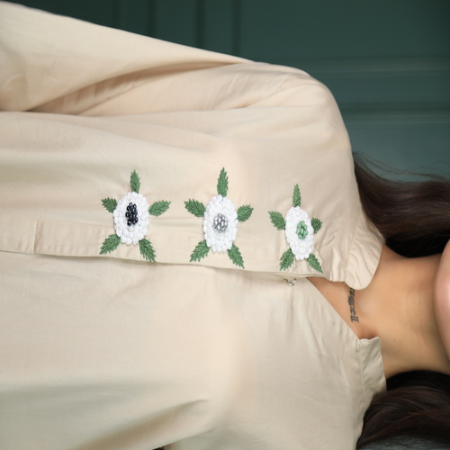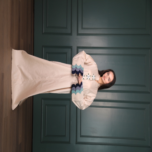 ثوب فاخرة بتصميم عصري وأنيق، مصنوعة من قماش القطن الناعم لمنحك الراحة والفخامة في آنٍ واحد. تتميز بتطريز أنيق على الصدر على شكل زهور بيضاء مع أوراق خضراء تضيف لمسة أنثوية راقية. الأكمام الواسعة مزينة بتداخلات متموجة بألوان الأزرق والرمادي والفيروزي، مما يمنحها طابعًا عصريًا وجذابًا.