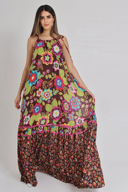 • دريس منقوش يأتي بمزيج مبتكر من قماش الشيفون الفاخر بألوان زاهية وقماش مشجر بأشكال بورد كبيرة وصغيرة.