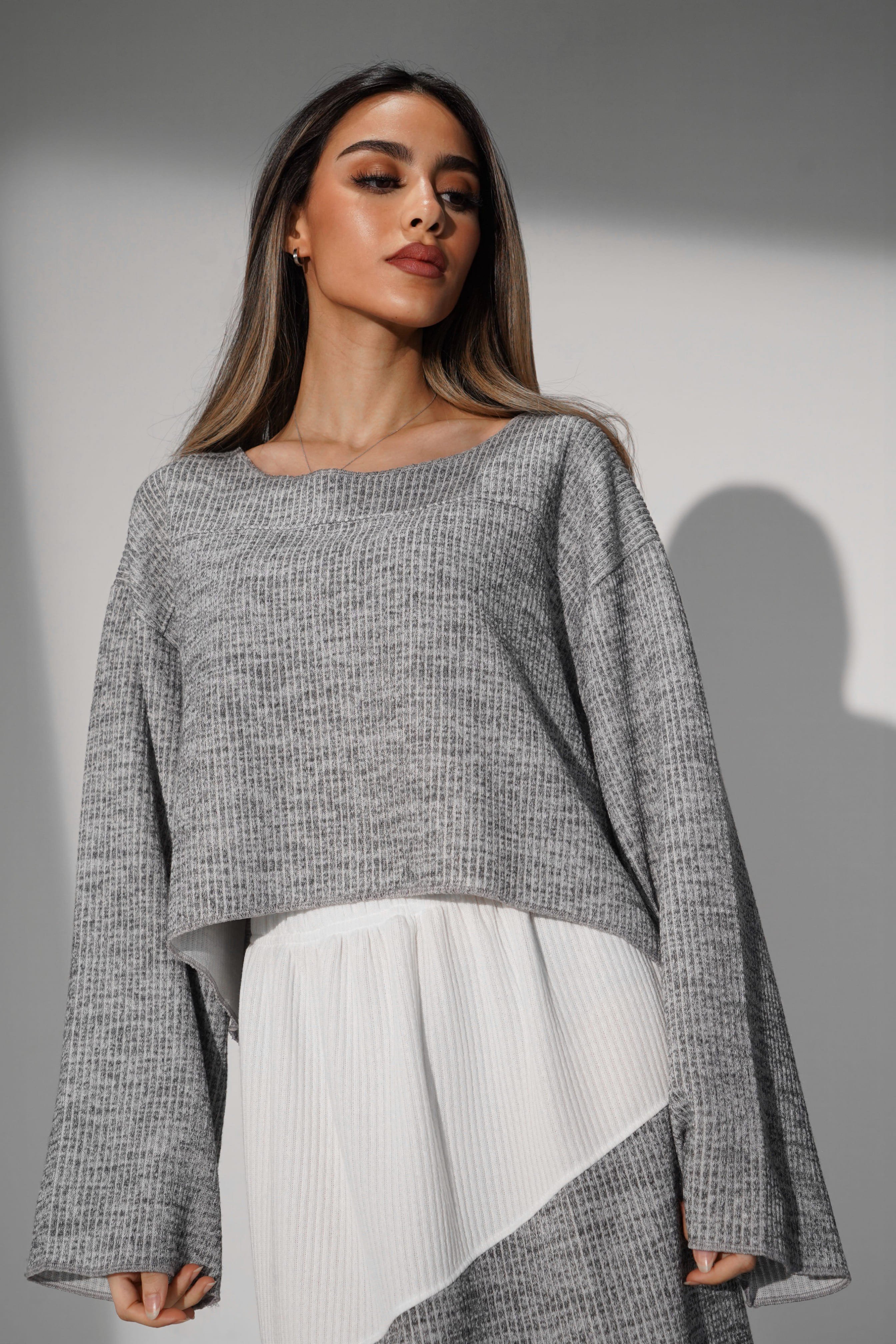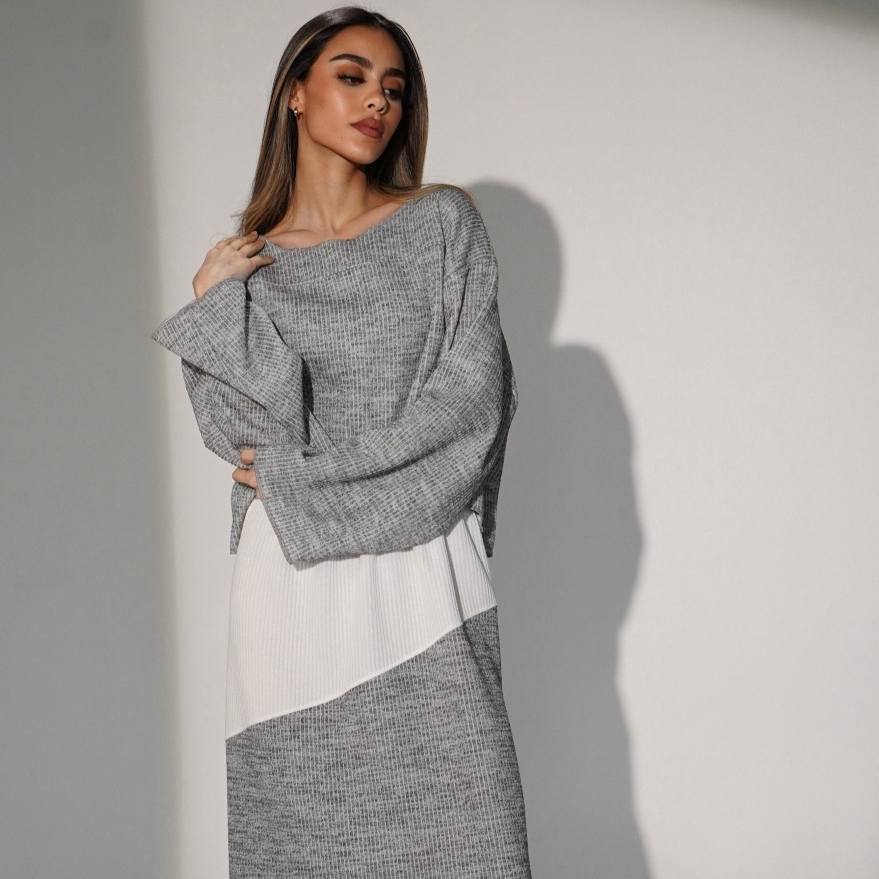 فستان مقلم إطلالة شتوية تجمع بين الراحة والأناقة بخطوط الأبيض والرصاصي هو الحل المثالي لكِ الذي يأتي بتصميم عصري ودافئ يضمن لكِ راحة طوال اليوم ويضيف لمسة من الفخامة لكل مناسبة شتوية احصلي عليه الان من Adara .