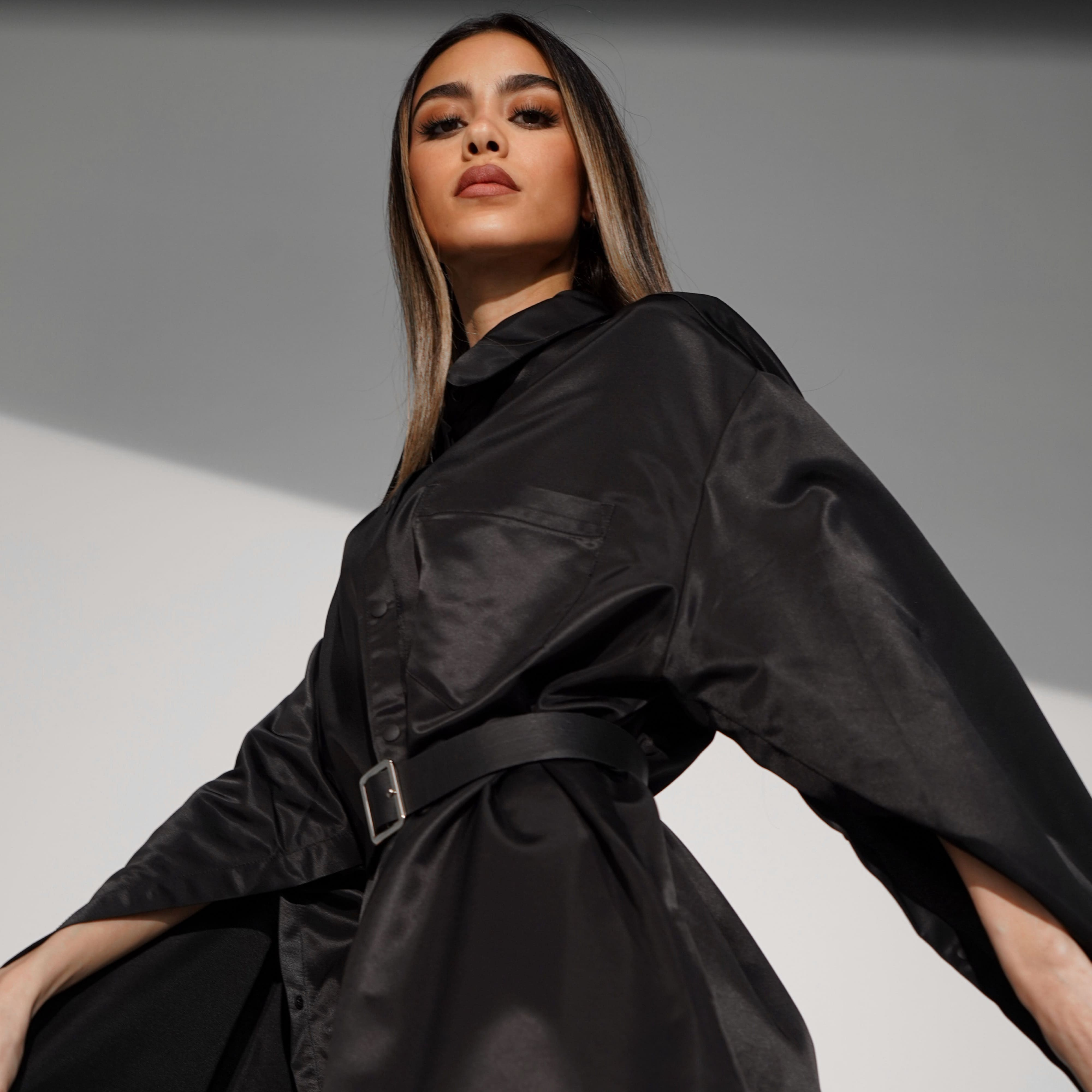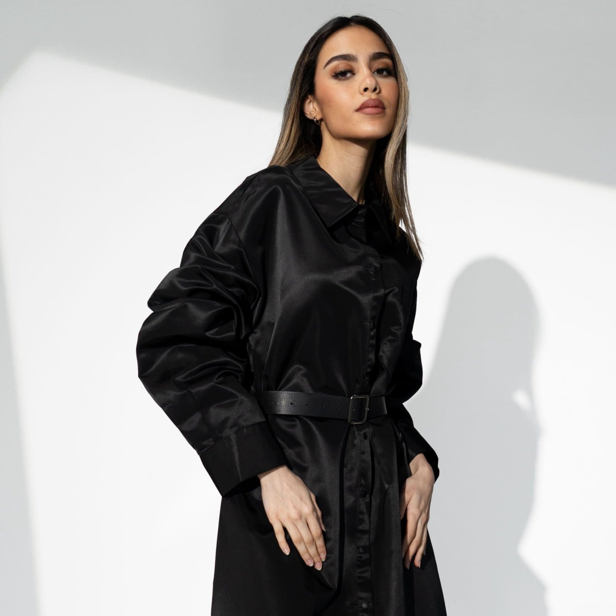 • فستان اسود ستان يجمع بين جاذبية المعطف التقليدي ولمسة الفستان الأنيق.
