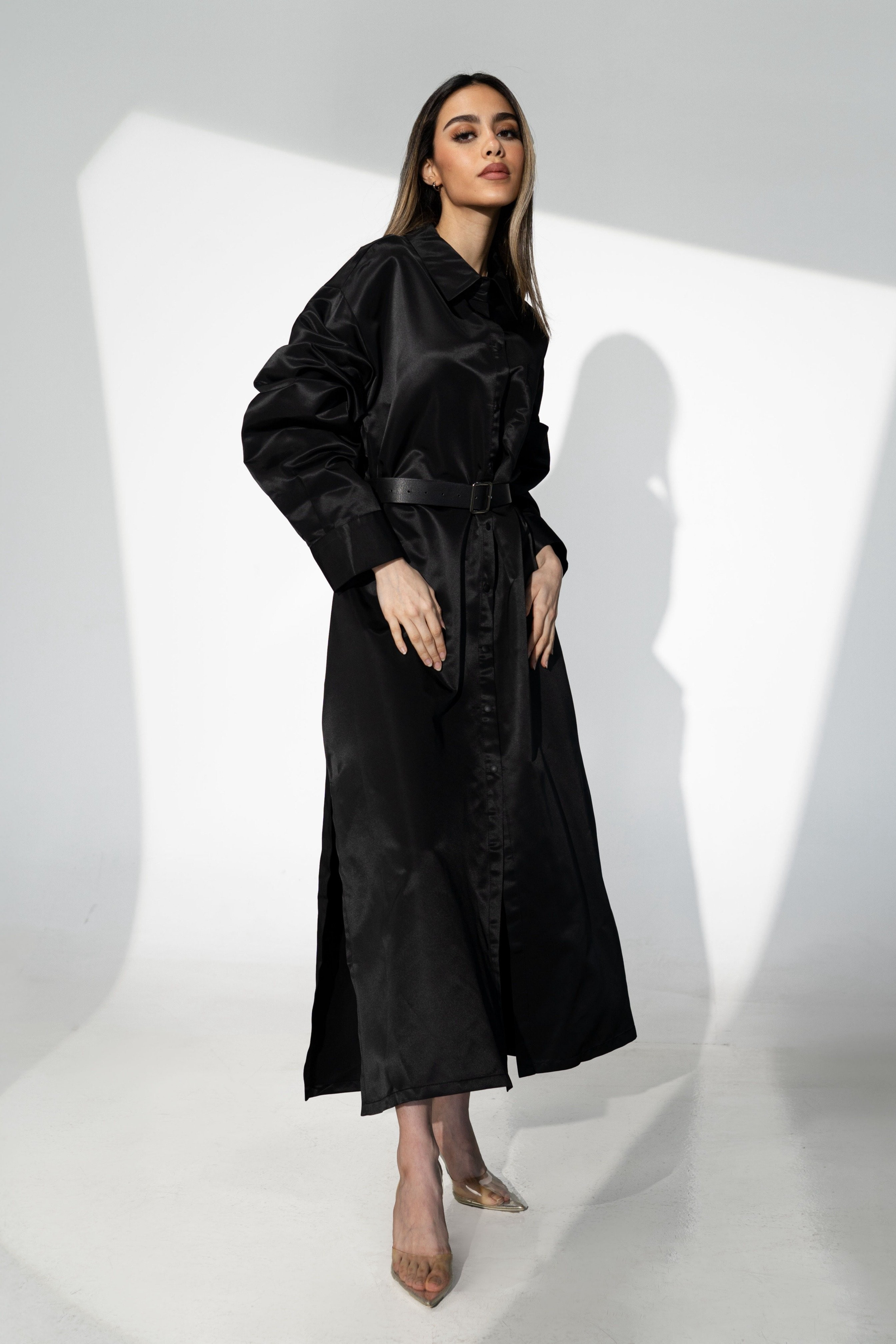- يتضمن ياقة واسعة وحزام خصر وجبهة مزدوجة لإبراز القوام بأناقة.